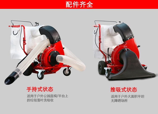 吸树叶机配置了HONDA品牌160CC汽油机,自走随进操作, 自驱速度可调, 还配有240升大容量集草袋和附加的大口径真空管吸咀, 清洁作业轻松方便, 吸树叶机性价比高。