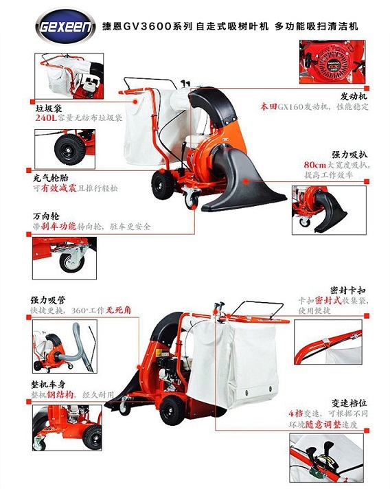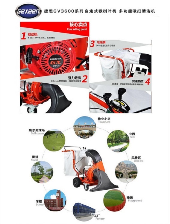 吸树叶机,GEXEEN捷恩品牌GV3600H吸树叶机是一款专门设计的以汽油机为动力的园林与市政使用的手扶移动式落叶负压吸取设备。 使用该吸树叶机设备,不惧潮湿, 不用吹扫,即可将路面,沟渠,灌木丛,甚至阴沟中的有机落叶和小型轻质垃圾轻松拾取, 实为秋冬季节清扫落叶和日常道路清扫之利器。 吸树叶机配置了HONDA品牌160CC汽油机,自走随进操作, 自驱速度可调, 还配有240升大容量集草袋和附加的大口径真空管吸咀, 清洁作业轻松方便, 吸树叶机性价比高。