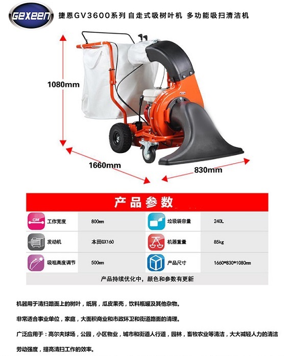 吸树叶机,GEXEEN捷恩品牌GV3600H吸树叶机是一款专门设计的以汽油机为动力的园林与市政使用的手扶移动式落叶负压吸取设备。