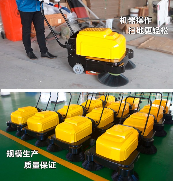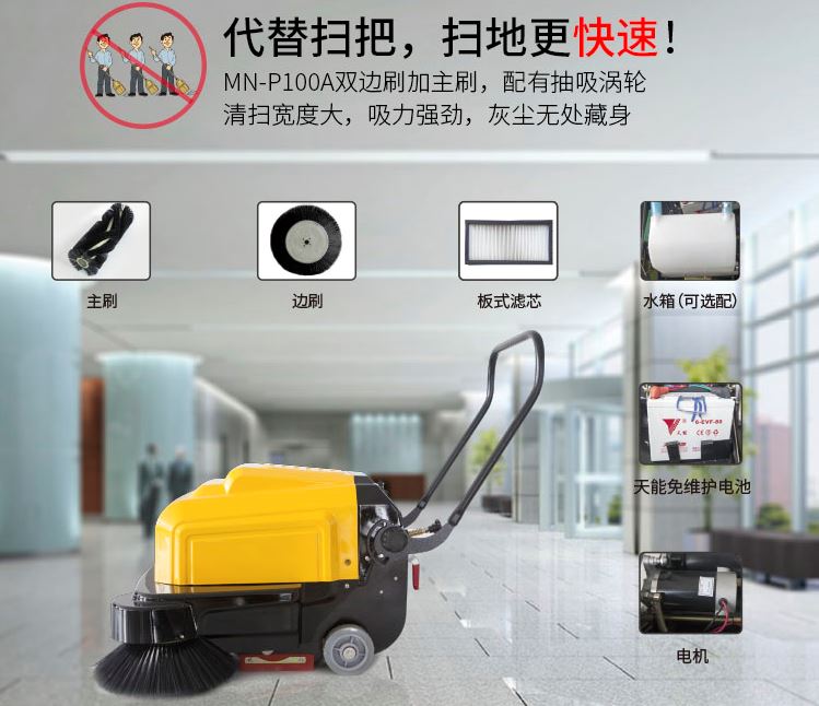 手推电瓶式西安明诺扫地机 MN-P100A,手推式扫地机特别适合大厅、候机候车室、医院、工厂、小区道路等场所的使用,清扫时无扬尘,无噪声,可以在人群中灵活穿梭,结构轻巧,推行轻便,维修简单,折叠存放。西安明诺扫地机设备要点:手推式/手扶式,充电式,吸扫结合,手动振尘。