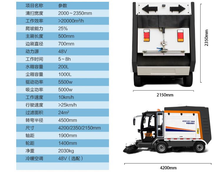 清扫宽度为2.35米,适合大面积清扫,工作效率高;