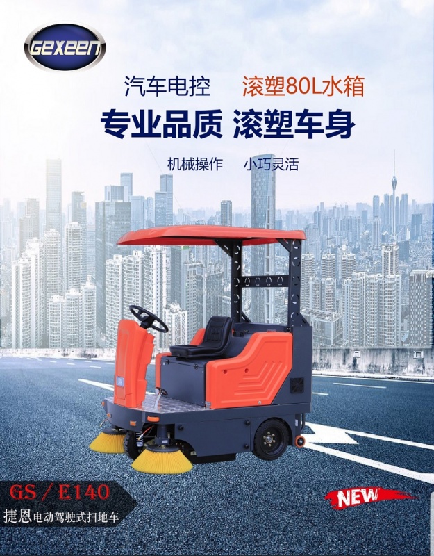捷恩GEXEEN品牌电动扫地车生产厂家GS/E140型电瓶驾驶式扫地车采用吸尘扫地的自动清洁体系。