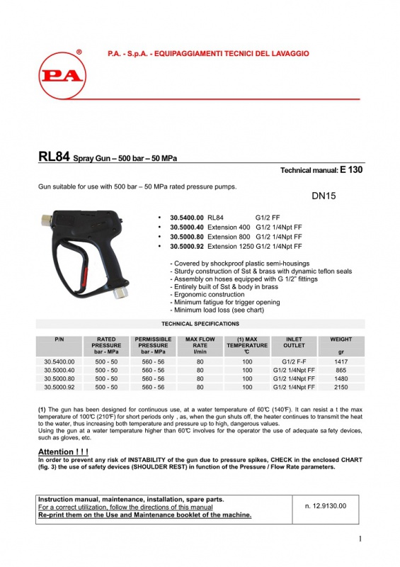 意大利PA RL84高压枪把所有零部件的设计和制造均在意大利本部完成,以极严格的内部质量控制程序对所有零部件进行精密装配, 使PA成为国际清洁市场的标杆龙头企业。